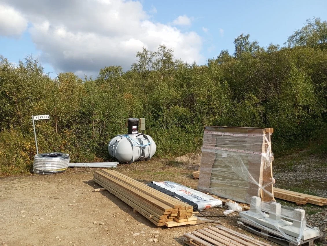 Construction materials including wooden planks, wrapped pallet, and metal container on construction site with trees in background.