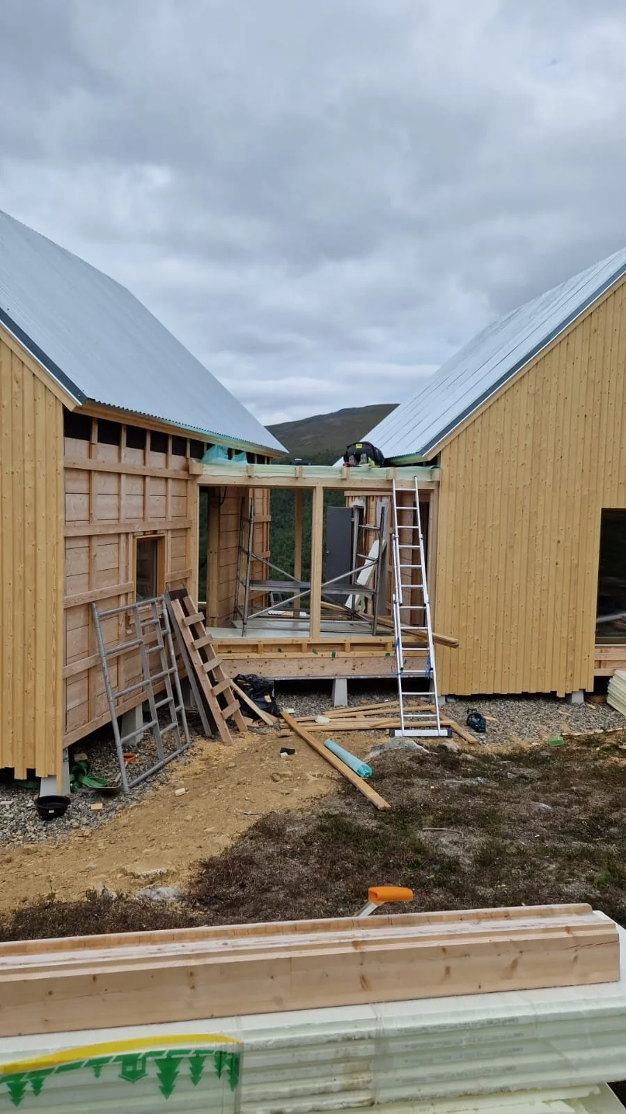 Construction of a porch or balcony between two wooden houses with metal roofs, scaffolding, ladders, and building materials on a cloudy day.