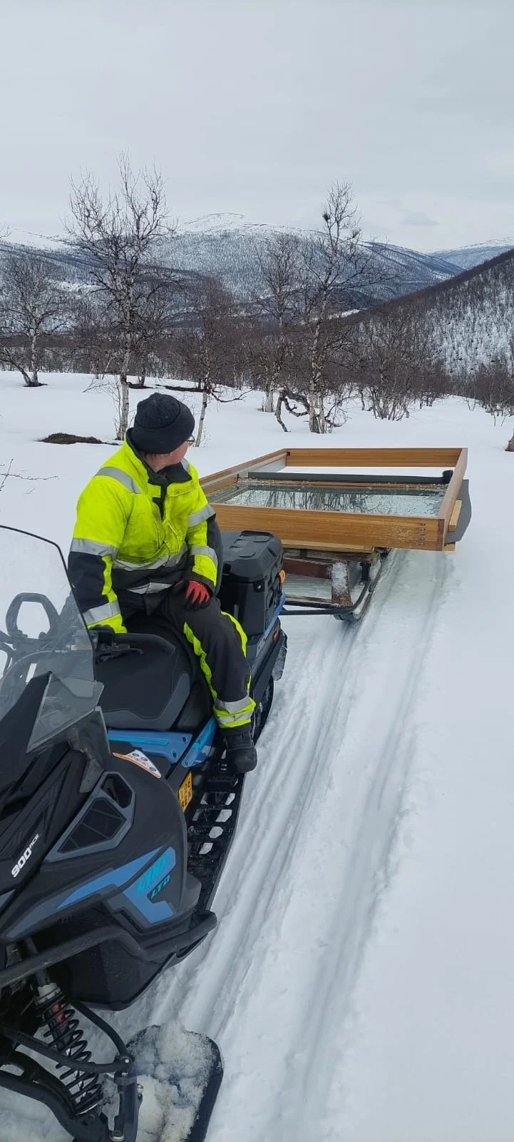 A man in yellow and black winter gear riding a snowmobile in a snowy landscape with leafless trees and mountains in the background. The snowmobile is pulling a wooden frame filled with water.