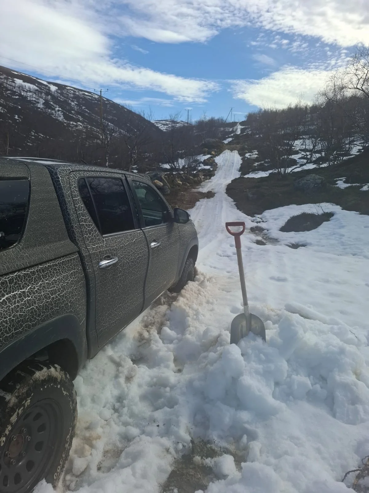 A black pickup truck stuck in the snow on a mountain road, with a snow shovel stuck in the snow nearby.