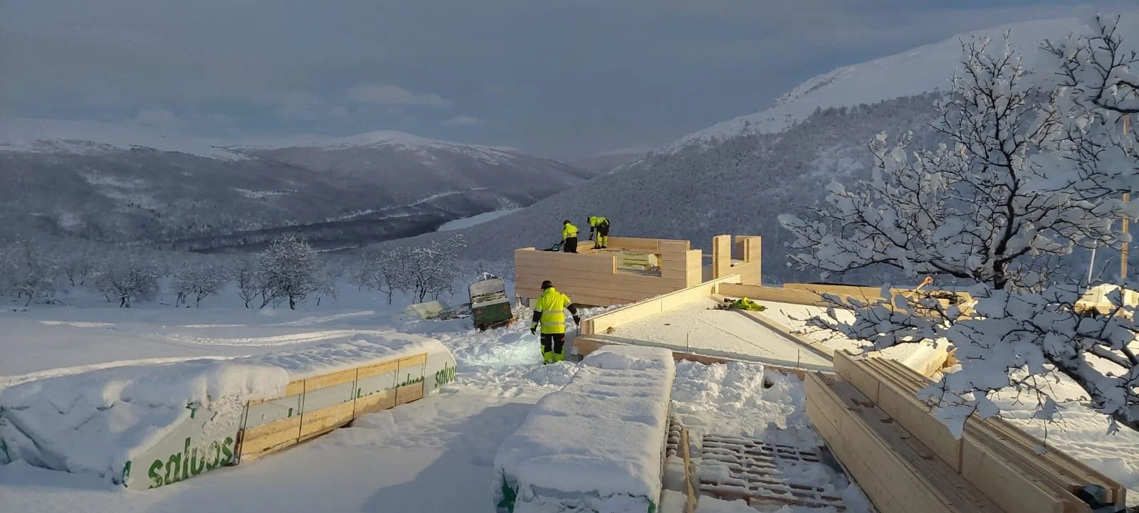 View from the roof of a wooden structure under construction in a snowy, mountainous area with snow-covered trees in the background. A worker in a high-visibility suit is standing inside the structure, and snowmobiles are parked nearby.