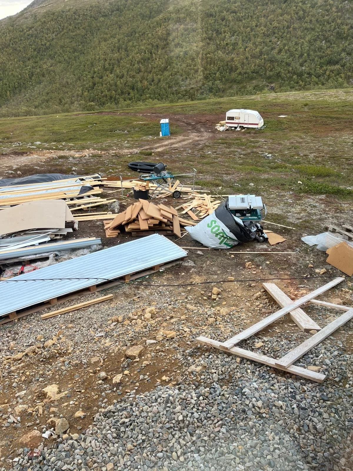 Scattered construction materials and debris on a dirt and gravel surface, with a mountainside covered in greenery in the background.