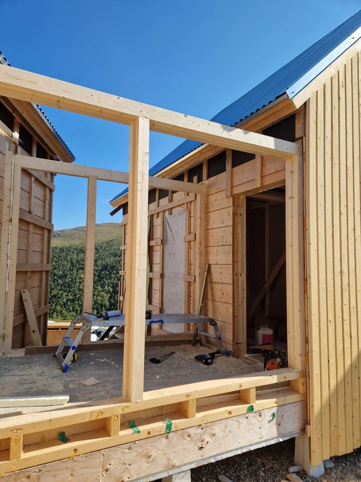 Construction site of a wooden house with framing and partial wall installation, tools and equipment inside.