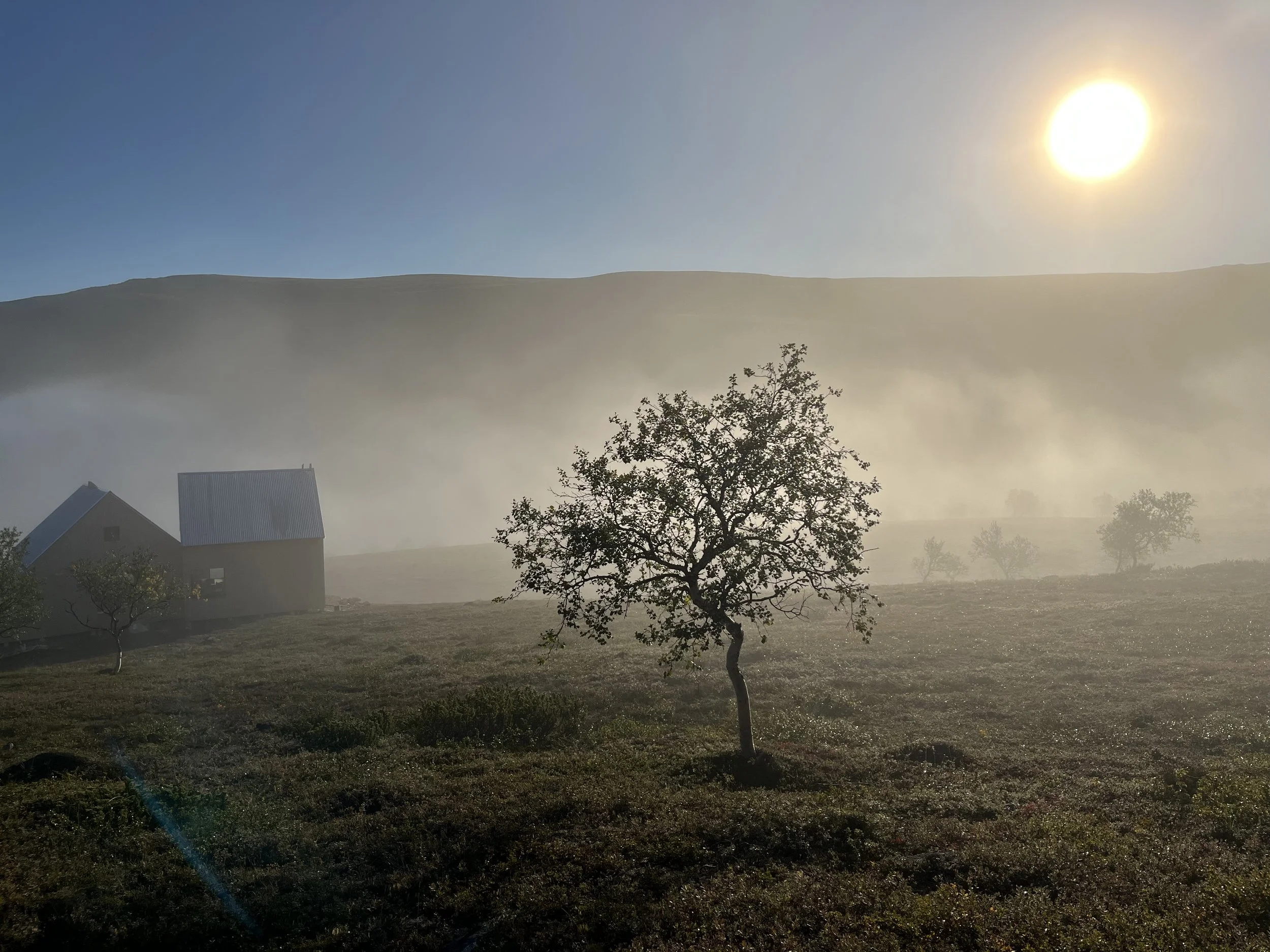 A rural landscape with a lone tree in the foreground, fog covering the middle ground, two small houses with metal roofs, and a hillside under a bright sun in the sky.