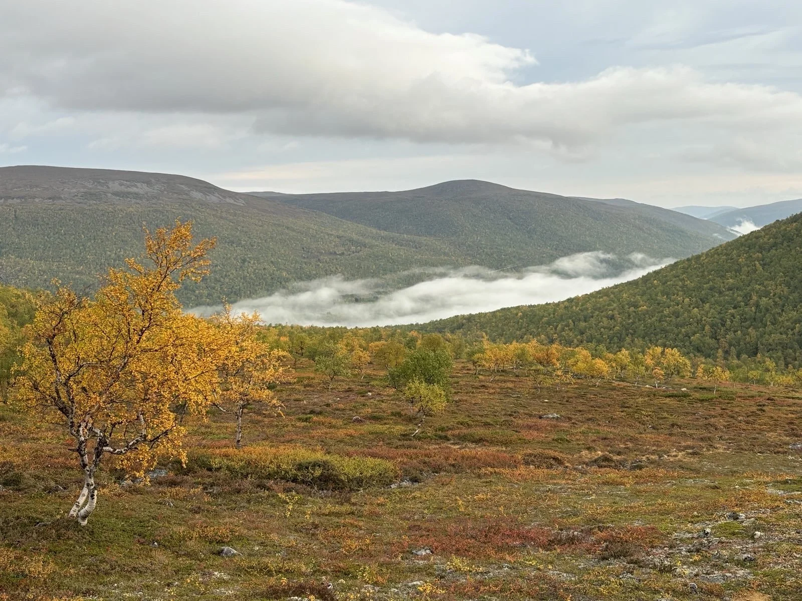 Scenic landscape of a mountain valley with rolling hills covered in green foliage, a few trees with yellow and orange leaves in the foreground, fog in the middle of the scene, and a cloudy sky above.