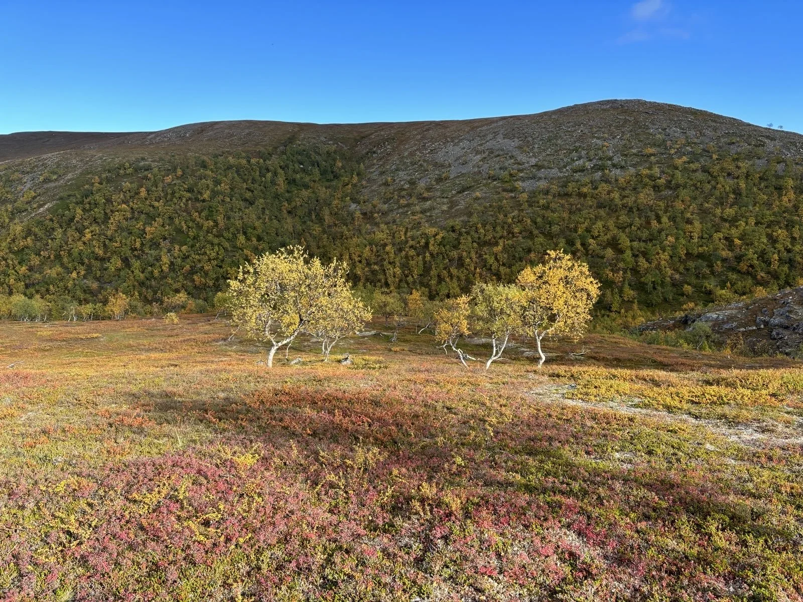 Scenic landscape of rolling hills with sparse, twisting trees with white bark, colorful ground vegetation, and a blue sky with scattered clouds.