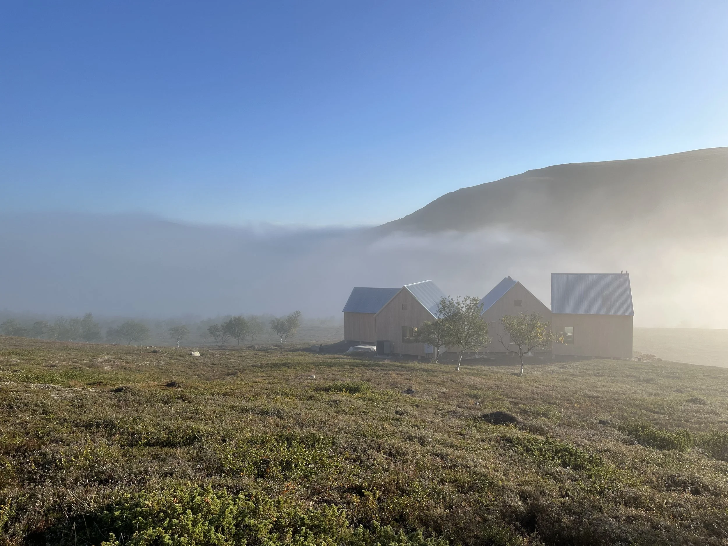 Three wooden houses with metal roofs in a foggy, grassy landscape with a mountain in the background.